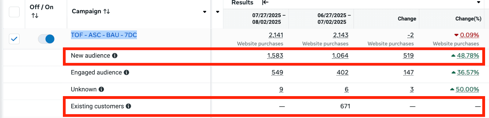 Meta’s audience breakdowns highlighted the issue: returning customers made up 70 to 80 percent of the traffic on campaigns that were supposed to attract new audiences.